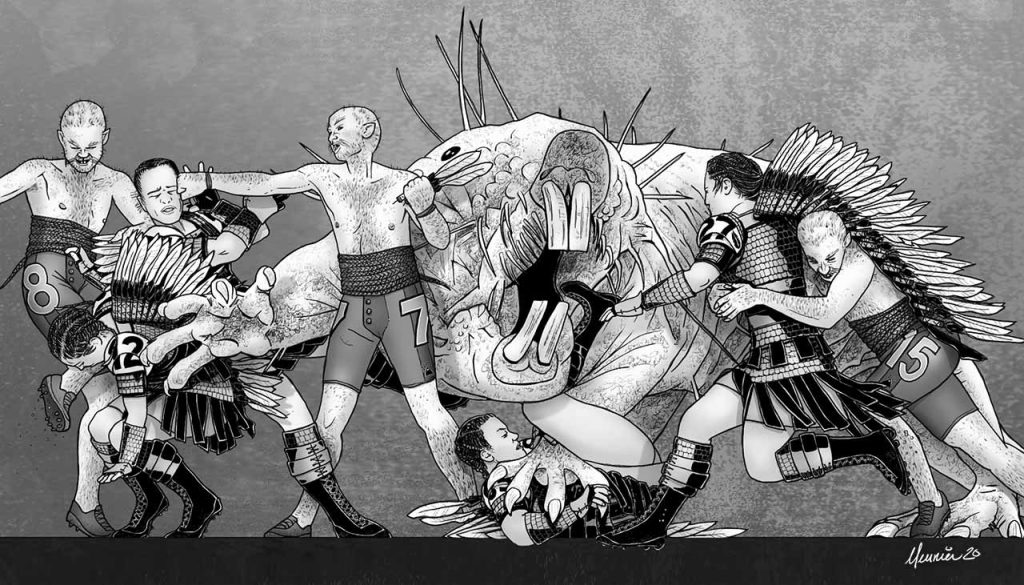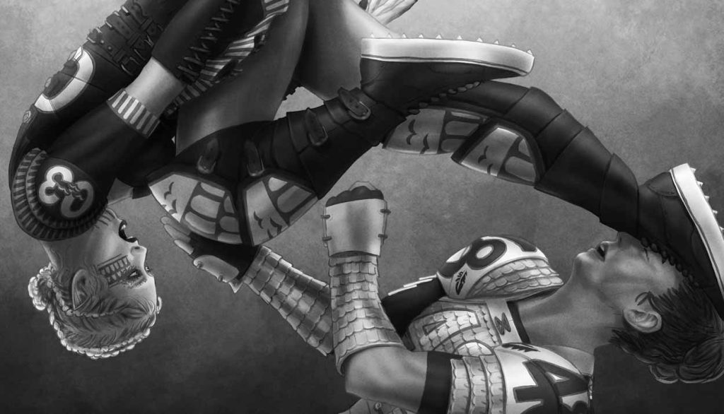 — Je pensais que nous étions censées en boire ? dit Jacyntha, en regardant le flacon que le coach Karsgaard avait fait circuler. — Oui, prenez-en une bonne rasade. Mais Rosépine a dit que si vous recevez des gouttes de bave, la rosée de vignerêve empêchera la peau d’absorber du vilain. — Si seulement nous pouvions, nous aussi, cracher des toxines sur eux, dit Pillcu, en faisant référence aux adversaires du jour, les Skitteringis sortis des maudits tunnels d’Ebolicorum situés sous les îles de l’archipel de Calxilanza à travers le détroit Calxi de Guayamartí.